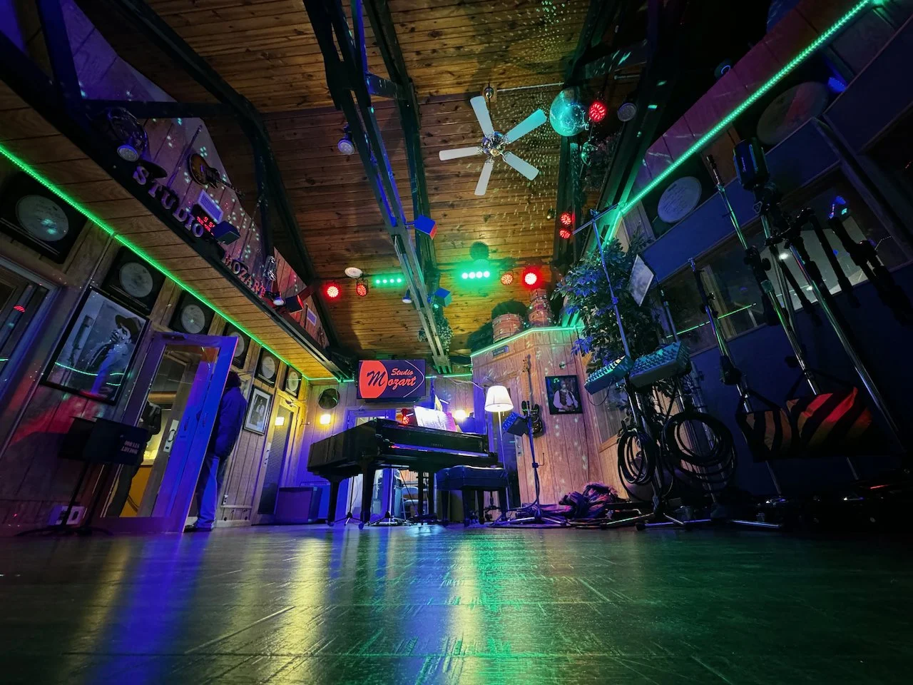 Our spacious live room boasts adjustable acoustic properties, enabling the creation of both lively and subdued sound environments. It comprises five insulated acoustic booths and a hallway, providing a total of seven insulated recording spaces.